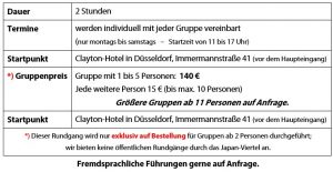 Lernen Sie das Düsseldorfer Japan-Viertel, auch ‚Little-Tokyo‘ genannt, von seiner authentischen Seite kennen. Erfahren Sie, warum so viele Japaner hier leben und was für sie besonders wichtig ist. Nirgendwo in Europa kann man auf so kleinem Raum japanisches Leben erleben und genießen. Bei einem Rundgang durch ‚Little-Tokyo‘ haben Sie die Möglichkeit, japanische Geschäfte zu besuchen und vor Ort die klassische japanische Ästhetik um Ikebana, Lackarbeiten oder Kimono zu bewundern.