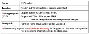 Dieser kurzweilige, humorvolle und informative Rundgang führt quer durch die Altstadt und endet am Maxhaus, der ehem. Schule von Heine; auf die auf dem Weg liegenden Sehenswürdigkeiten wird selbstverständlich auch eingegangen.