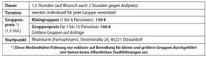 Die MedienHafen-Führung bietet ein einmaliges Erlebnis in Deutschland: Aus dem ehem. Düsseldorfer Industriehafen wurde der MedienHafen mit ganz außergewöhnlichen architektonischen Highlights, wie z.B. die „Tanzenden Bauten“ des amerikanischen Stararchitekten Frank O. Gehry oder dem „Colorium“-Hochhaus des britischen Architekten Will Alsop, im Kranhaus-Stil und einer Fassade, die an Mondrian-Gemälde im Großformat erinnert. Und das alles unmittelbar neben historischen Fassaden und umgestalteten Lagerhäusern .